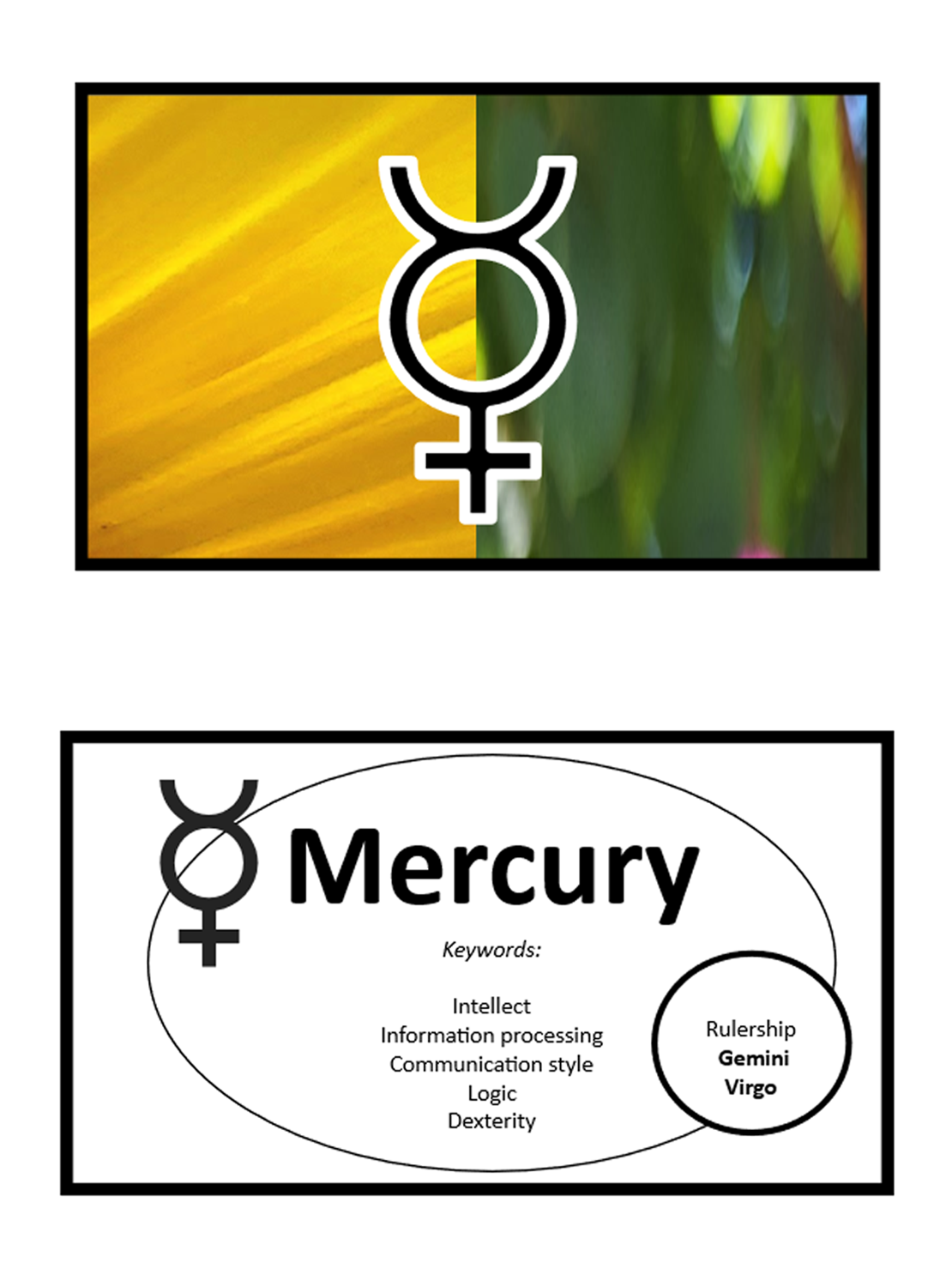 Blend what you know about the symbolism of Mercury (use your Mercury Card) with the meaning of a planet in retrograde or direct motion. Explore what this combination might mean in different situations that relate to Mercury’s energy.